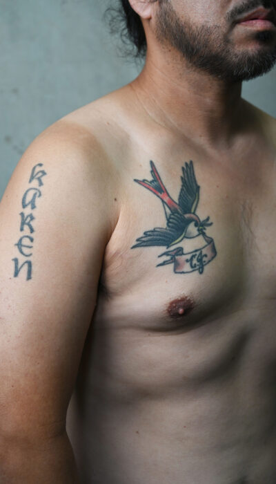 A swallow on his chest with his son’s initials on a nameplate because he didn’t know if he would make it back from Iraq