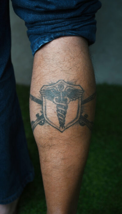 Caduceus on his right calf